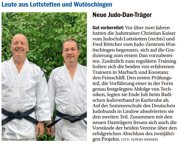 Di., 12.8.2025: Glückliche Gesichter nach der bestandenen Dan-Prüfung zeigen Fred vom Judo-Zentrum Wutöschingen mit seinem Trainingspartner Christian vom Judo-Club Lottstetten. Wir freuen uns sehr, einen weiteren Schwarzgurt in unserem Verein zu haben. Herzlichen Glückwunsch Fred! 2 Jahre intensives Training wurden belohnt!